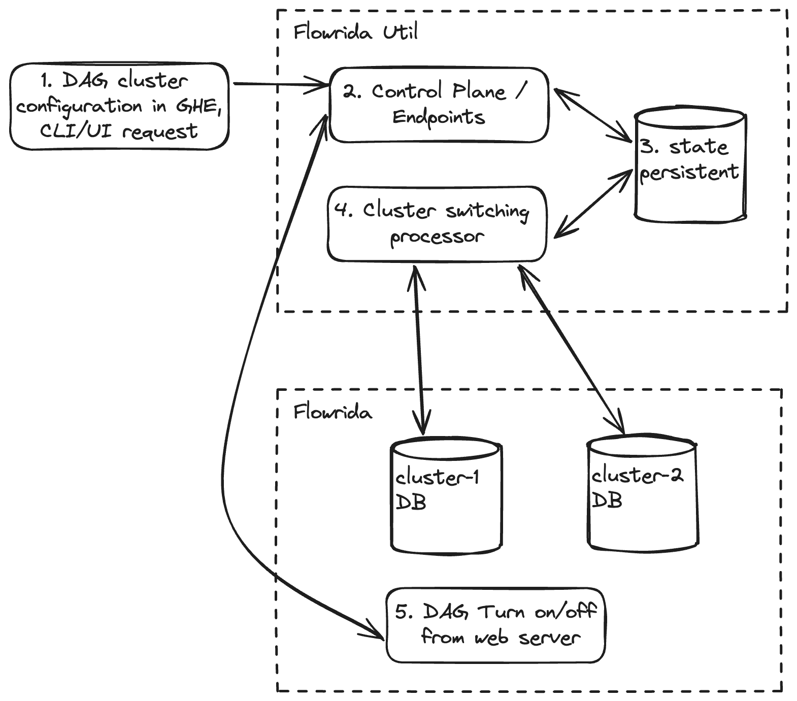 The DAG Switching Service is fundamental to Flowrida's multi-cluster strategy, enabling both fast incident mitigation during cluster failures and controlled rollouts. Its core goal is to develop a fast (within minutes) and safe method for switching DAGs between clusters, addressing situations like unhealthy clusters, Airflow upgrades, or phased rollouts.
