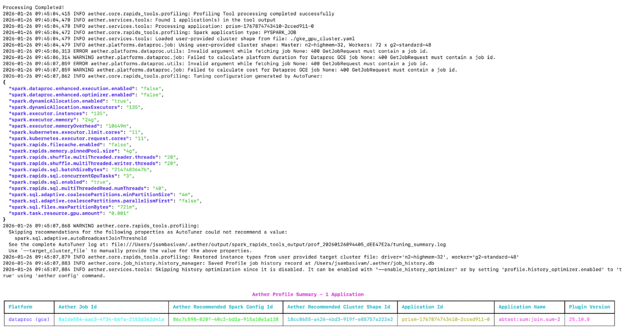 NVIDIA’s Project Aether, an automated Spark tuning tool, played a key role throughout the migration. Given an event log, Project Aether produces recommended configurations for GPU execution, as well as suggestions to improve runtime or cost. It helps in multiple ways: