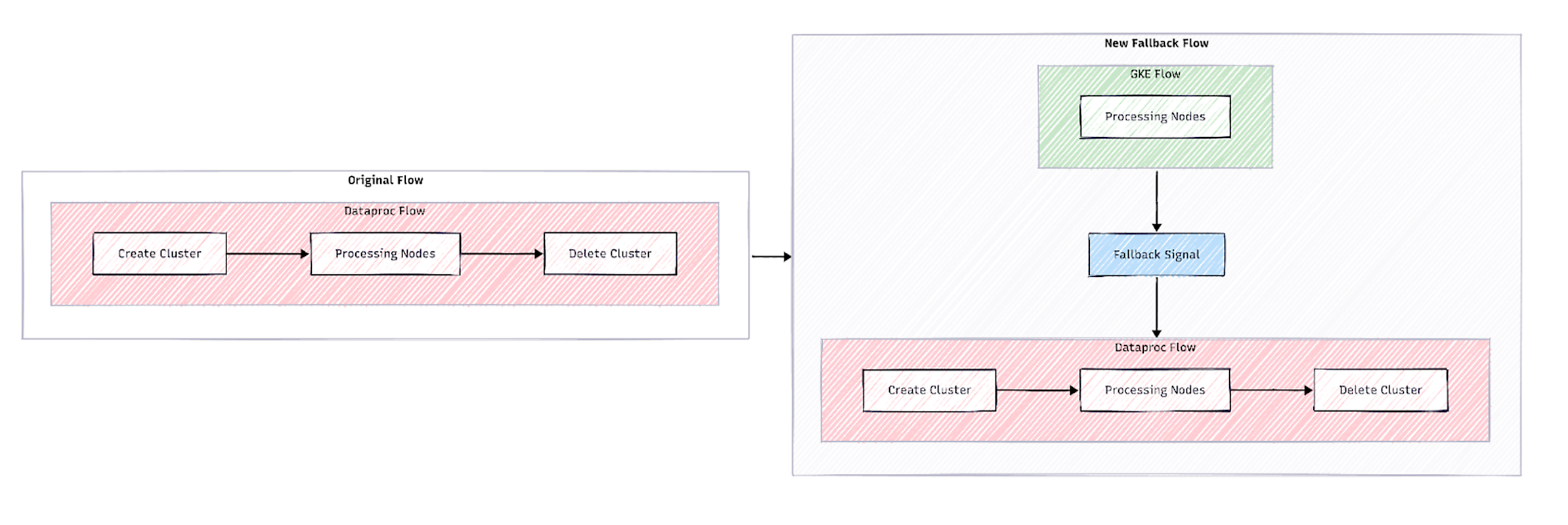 Because of these concerns, we preferred to migrate with a fallback logic: if a workload failed on GKE, it could be re-attempted on the original Dataproc-based architecture.