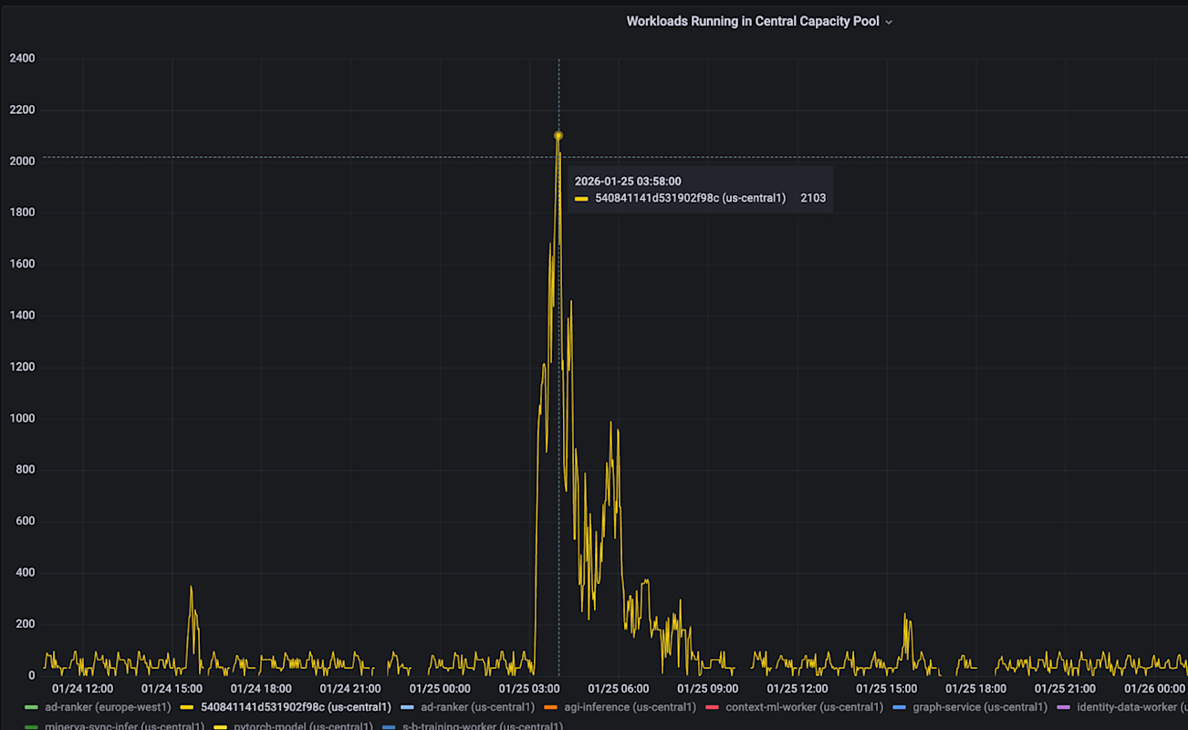 Although Dataproc on GPU confirmed the performance improvements we anticipated, it also highlighted that on-demand capacity could not support our entire production footprint. The AB pipeline operates within a narrow morning window, creating a high concentration of GPU demand. Maintaining our SLA would require processing roughly seven shards every thirty minutes, necessitating approximately 2,100 concurrent L4 GPUs and a total of 11,400 L4 GPUs throughout the full execution 6. Since this requirement for burst capacity surpassed what was available, it became evident that we needed an alternative strategy for managing capacity.