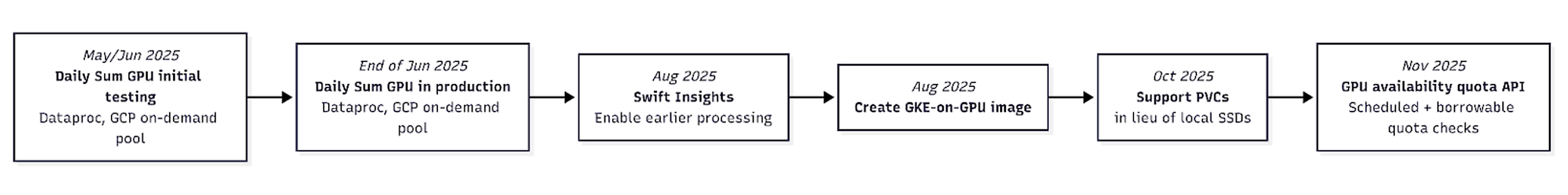 Another internal initiative, codenamed Swift Insights, aimed to deliver earlier AB results. This work allowed our pipelines to shift into the 3 AM–6 AM window, aligning perfectly with the downtime in GPU usage.